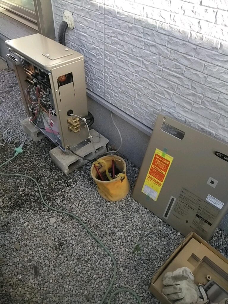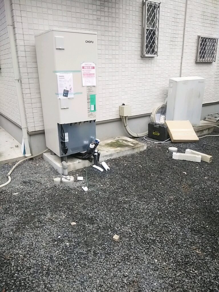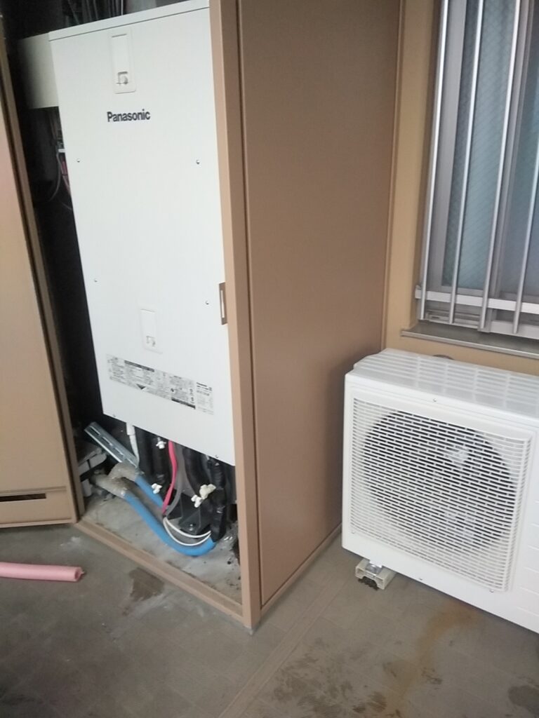 とても狭くて搬入困難でしたが 気合い入れてスッキリ仕上がりました。同じ長府製品からの交換で配管施工もスムーズでした。過去にヒートポンプの配管漏水で 訪問しました ユーザー様宅です。ありがとうございました。