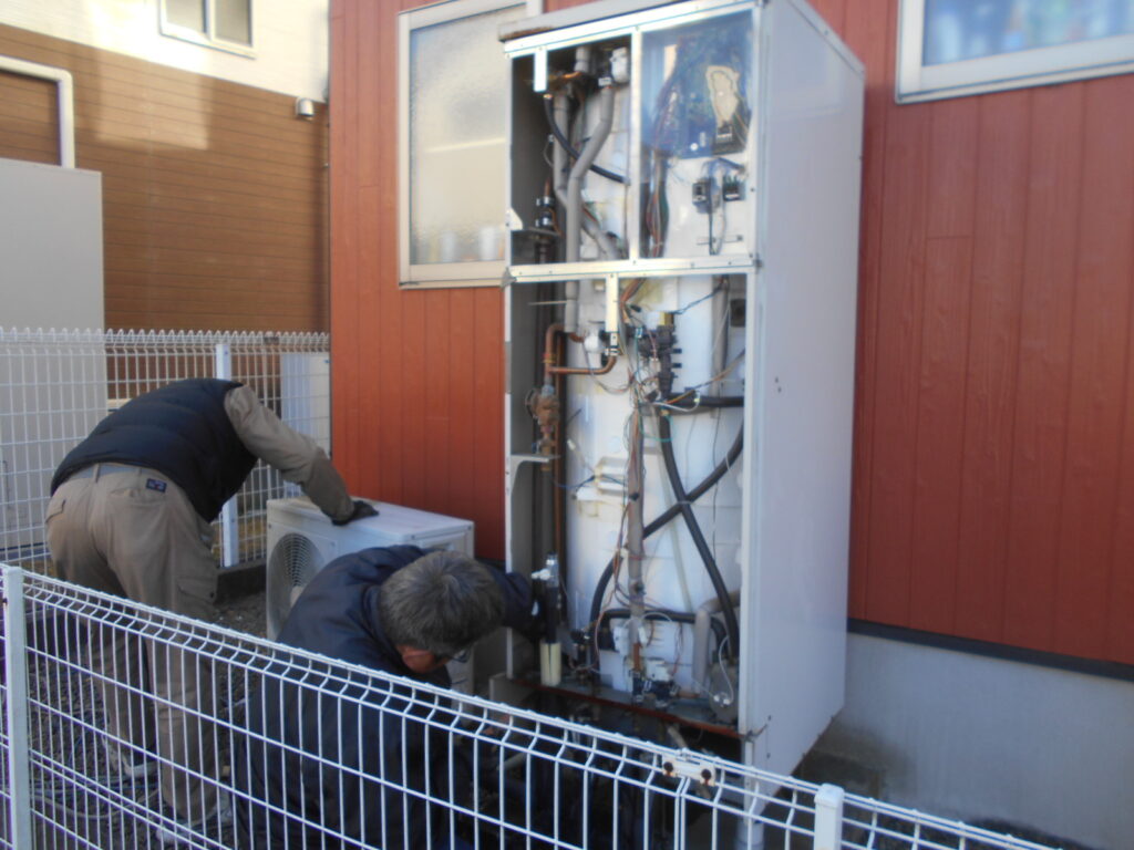 今までご利用されておりますエコキュートのベースが傾いて ピサの斜塔のような形になり美観的にも 問題が出ました。今までご依頼されておりますホームビルダーが やめてしまい依頼するのが出来ず 大変お困りのユーザー様からの依頼です。とりあえず水抜きしまして 軽量にして 捨てコンクリート周りに敷き詰めましてベース直しです。幸い 水道給水配管に 給湯配管がベースの 外側でしたので 上手く巧みに低料金で解決しました。他店様で お断りされた、住宅のビルダーさんが訳ありで廃業した、などお困りになりましたら 当店へアクセスしてくださいませ。親切真心で 対応いたします。